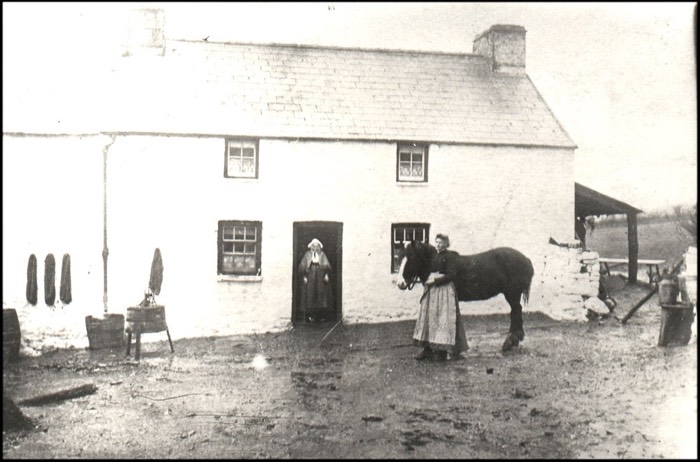 Ann Evans (in doorway) her daughter Jane with the horse at Tybrych, Llanddesuant